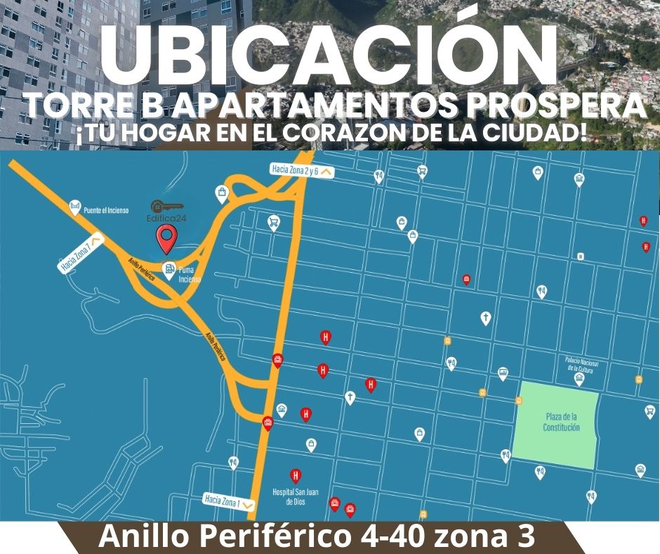 Ubicación estratégica en el corazón de la ciudad, este proyecto se sitúa en el carril auxiliar del periférico, con acceso directo a la zona 1 por la avenid Elena, conexión al periférico hacia la zona 7 y salida a la zona 2 mediante una vía directa a la calle Martí.